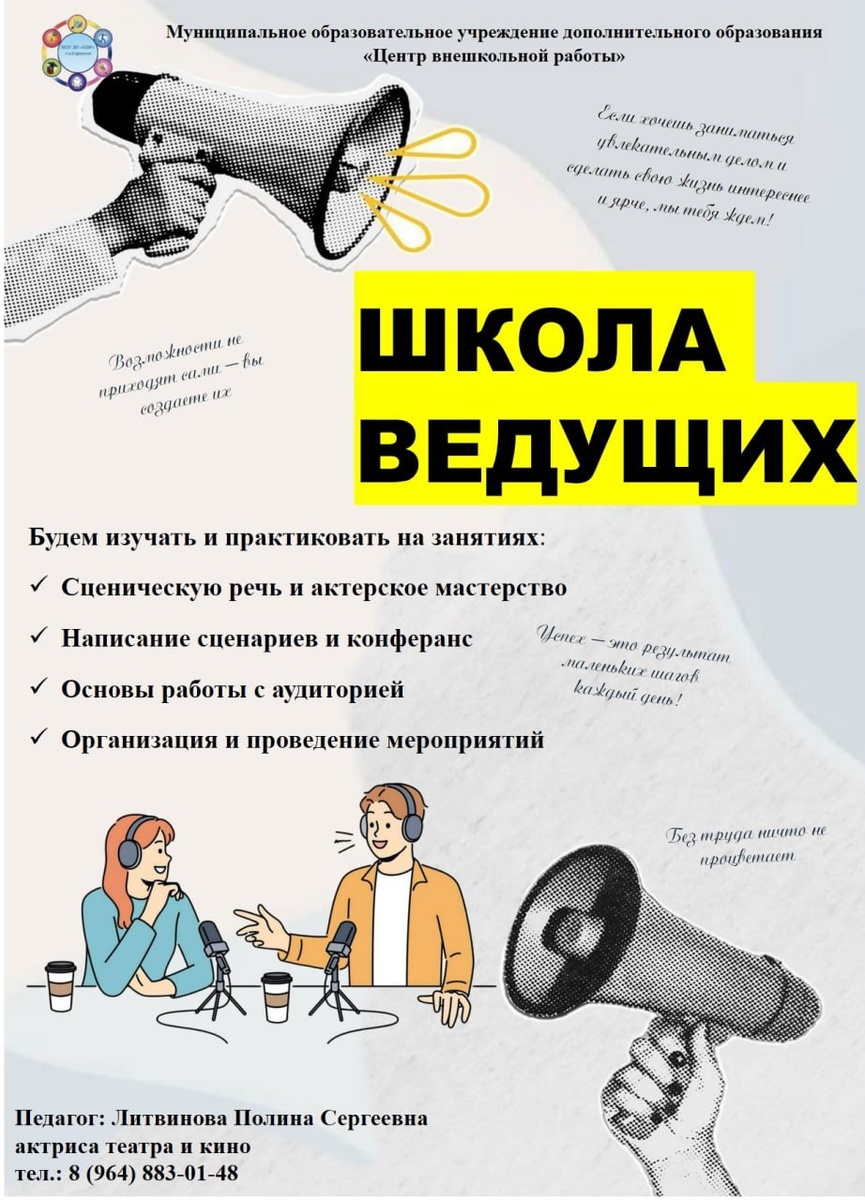 ✨ Открыт набор «ШКОЛА ВЕДУЩИХ» ✅В программу входят техника речи, риторика и ораторское искусство, актерское мастерство. Педагог уделяет отдельное внимание развитию дикции и управлению голосом, раскрывает природный артистизм ребенка. 👉Набор открыт для детей от 7 до 17 лет ❗️Запись через портал госуслуги (ID группы для записи 238085) ❗️Занятия БЕСПЛАТНЫЕ 🎤Педагог Литвинова Полина Сергеевна (Актриса театра и кино). РАСПИСАНИЕ: 📌1 группа (среда, суббота 15:30-16:15; 16:25-17:10) 📌2 группа (среда, суббота 17:30-18:15; 18:25-19:10) ✅Вопросы по телефону: 8 (964) 883-01-48 🏢 Досуговый центр Юность 📍г. Серпухов, ул. Весенняя, д. 2 💰 Вход свободный❗️ ⭐Поддержать канал голосом 💰 Вакансия - курьер в Серпухове ✅ Мероприятия Серпухов https://dzen.ru/id/66f01c6eb4c6fe60c9ca1608 http://vk.com/serpukhov_events http://dzen.ru/serpukhov_events