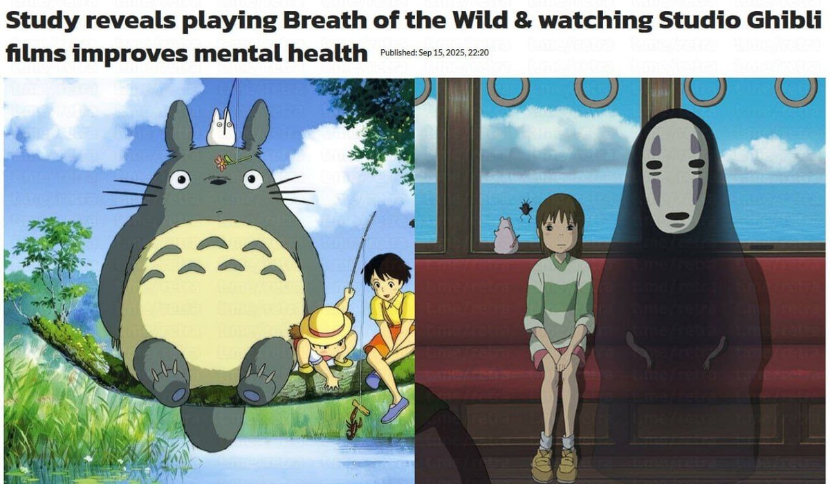 Исследование показало, что просмотр аниме студии Ghibli и игра в Zelda повышают уровень счастья — но стоит отнестись к этому с долей скептицизма. Ученые разделили респондентов на четыре группы: одни смотрели Миядзаки, вторые играли в Зельду, третьи делали и то, и другое, четвертые ничего не делали. Предполагаемые механизмы: ностальгия создает чувство безопасности, мягкая эстетика Ghibli снижает стресс, а открытые миры усиливают эффект. Впрочем, Тоторо действительно делает день лучше — тут даже исследования не нужны. #anime ___ Garbage Legacy