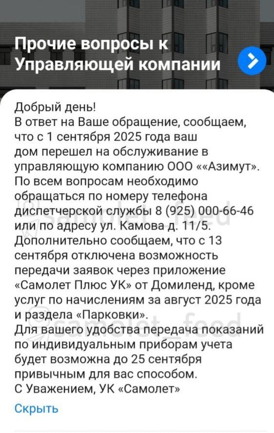 Соседи чьи дома остались на обслуживании в УК "Самолет-Сервис" жалуются, что все их заявки закрывают с комментарием о том, что нужно обращаться в УК "Азимут". При этом в тех домах откуда ушёл "Самолет-Сервис" приложение не дает сделать заявку. ________ Присылать новость @mstislavz 👉 Обсудить в чате ЖК 👉 Подписаться на канал