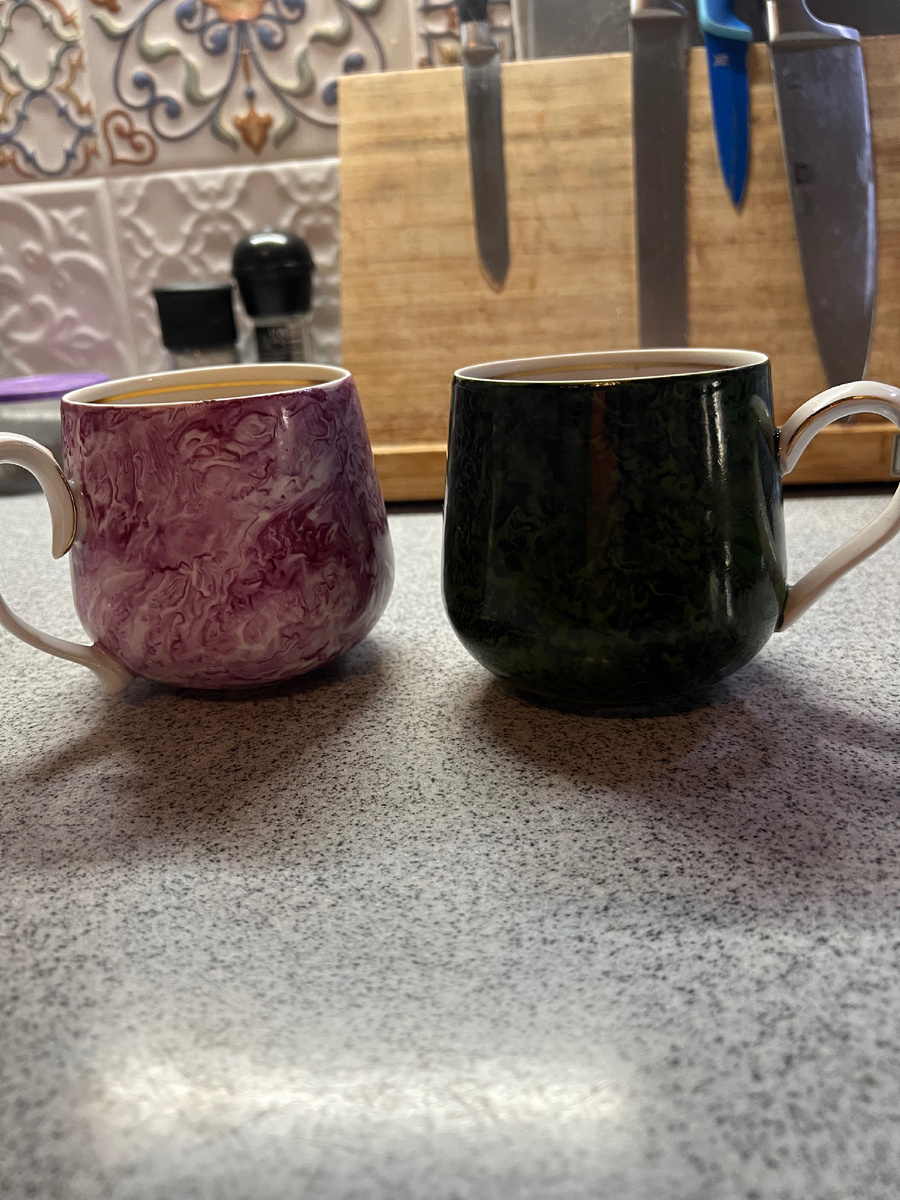 Приветствую, мои дорогие! Чуть позже забегу а вам на огонек, точнее вечером! А пока о делах насущных) Все смешалось в доме Облонских в нашей семье три с половиной года назад. Праздники и выходные превратились в будни, а потому редкий свободный день моей половины - уже праздник! И выпал он на сегодняшний день, а значит, хочется приготовить что-нибудь вкусненькое и подать на стол в красивой посуде! Вот и нашелся повод достать из шкафа сысертский фарфор, успевший там впасть в тоску за полторы недели, как мы вернулись из отпуска. Правда, справедливости ради, должна сказать, что отдельные экземпляры у нас в ходу с первого дня по возвращении. Да, унас появились новые кружки чашки для кофе. Давно хотелось купить чашку именно такой формы) Не поверите, моя кружка темного цвета, а у мужа - светлая) Просто сначала я увидела свою, а потом уговорила мужа тоже купить себе кружку, но темных больше не было! Теперь меня по утрам радует кофе в малахите, а в него кофе с молоком в соотве