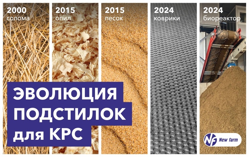 Подстилки для КРС прошли путь от традиционной соломы до современных биотехнологических систем. Эволюция технологий отражает стремление фермеров одновременно повысить комфорт животных, снизить затраты и упростить управление хозяйством. До 2000-х гг. в молочном животноводстве применялись в основном доступные материалы: Солома - дешёвая и массовая, но требующая больших объёмов хранения, дающая пыль и повышающие риск респираторных заболеваний. Глина и деревянные настилы - обеспечивали ровное покрытие, но быстро теряли свойства и увеличивали травматизм животных. Опилки - удобны в применении, но имеют высокий бактериальный фон и требуют регулярного обновления. На фермах активно внедрялись механизированные решения: Резиновые маты - снижение расхода органики, но ограниченный комфорт и риск суставных проблем. Глубокая подстилка (солома/опилки с ферментацией) - высокая энергоёмкость и затраты, но заметное улучшение комфорта. Ключевые решения: Биотехнологические установки (БРУ) для переработки