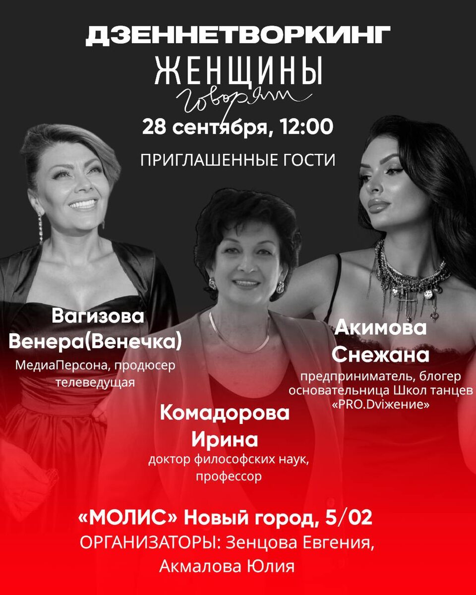 Приветствую, дорогие друзья! ❤️ Приглашаем вас на уникальное событие этой осени — дзен-нетворкинг «Женщины говорят»! Это не просто встреча, а пространство, где мы отказываемся от шаблонов и знакомимся через искренние истории, которые меняют жизни. ✨ Почему это стоит вашего времени? Мы создали атмосферу, где не важно, кем вы работаете — важно, какой путь прошли. Здесь каждая история становится мостом к доверию, а не к конкуренции. Вы сможете: · Услышать откровенные истории женщин, которые не боятся быть настоящими · Найти поддержку и вдохновение в кругу единомышленниц · Рассказать о себе без страха оценки 🌟 Особенные гости вечера: 1️⃣. Ирина Комадорова Доктор философских наук, профессор, счастливая жена, мама и бабушка. После 50 лет начала покорять горные вершины: Камчатка, Шри-Ланка, Гималаи! А в 60 освоила мотоцикл. Доказывает, что возраст — не предел для смелых жизненных поворотов. 🏍 2️⃣. Венера Вагизова (Венечка) Медиаперсона, продюсер, телеведущая и Генеральный Директор ОО