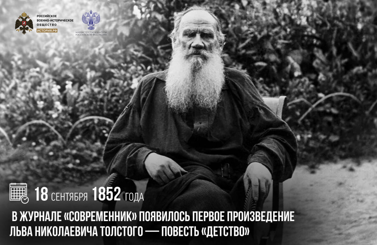 18 сентября 1852 года в журнале «Современник» появилось первое произведение Льва Николаевича Толстого — повесть «Детство»