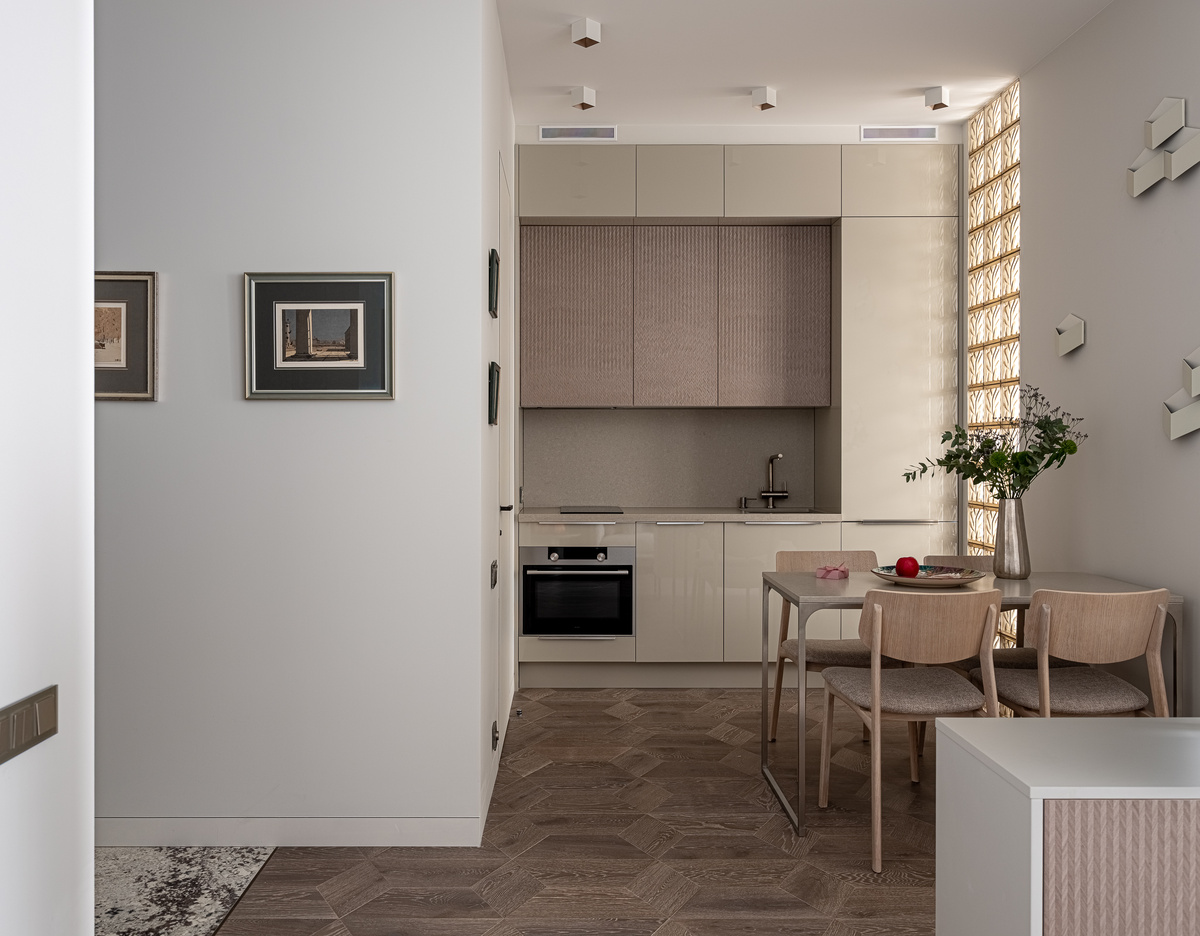 В интерьере и мебели использованы мягкие оттенки серого и бежевого, которые прекрасно подходят для минималистичного стиля и создают мягкий и уютный интерьер. Кухня объединена с гостиной общим дизайном: гладкие глянцевые фасады и деревянные акценты подчёркивают премиальный характер, а тёплый нейтральный свет делает пространство ясным и комфортным. Каждый элемент мебели продуман до мелочей – от материалов фасадов и подсветки до механизмов открытия и интегрированного кронштейна для телевизора, которого вы скорее всего не видели раньше.