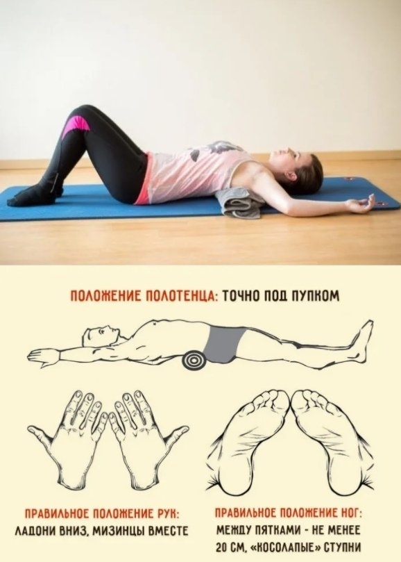 Положите валик под поясницей на уровне пупка. Руки за головой, ладони вниз, мизинцы соединены. Ноги прямые, большие пальцы стоп сведены вместе, пятки слегка врозь