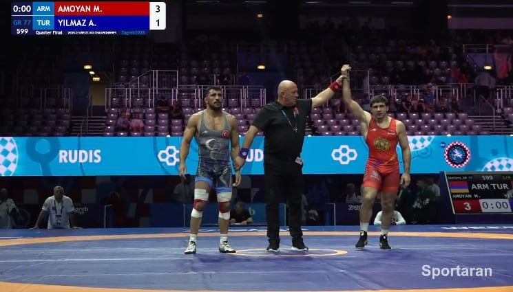 Малхас Амоян (77 кг) одержал победу над представителем Турции Ахметом Йылмазом и прошел в полуфинал ЧМ 2025 по греко-римской борьбе. Об этом сообщает Федерация борьбы Армении.