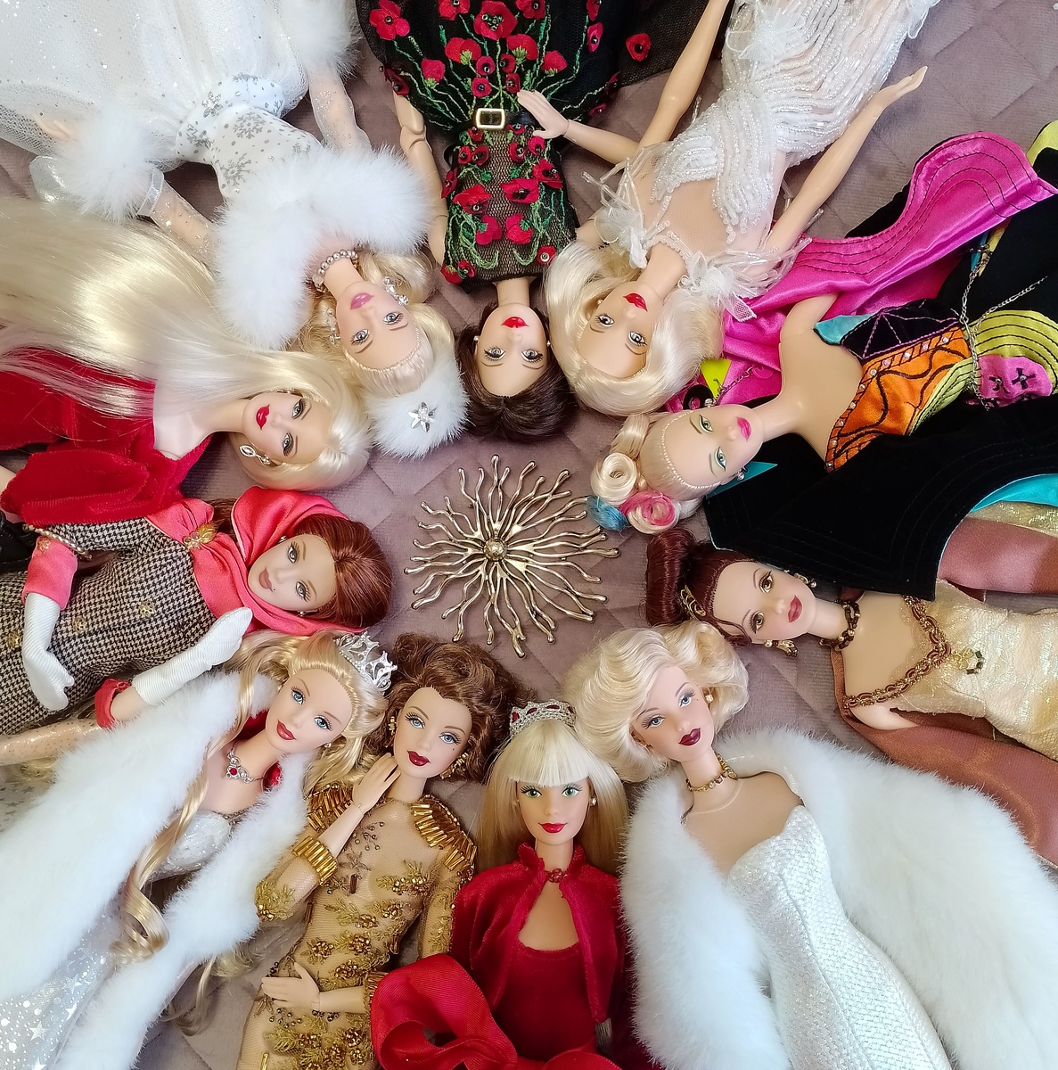 Всем привет, дорогие друзья! Заметила я появление "ромашек" на каналах соратников по хобби и решила поучаствовать, уж очень идея заманчива. Челлендж предложила Марина, автор канала "Лисичкины куклы". Для "ромашки" нужно придумать какой-то критерий - то ли любимый молд, то ли цвет волос, я решила взять и то, то😁 "Остапа понесло!" - как говорится. Любимый молд Барби - это молд моего детства, молд Маки, у автора идеи ромашка тоже из Маковок, но одинаковых у нас всего две куколки, любопытно, каково всё же разнообразие этих кукол и какой у всех разный вкус. Вот моя "маковая ромашка". Как оказалось Барби на молде Маки у меня всего лишь 11, а я думала больше - в общем, есть куда расти😁 Минимум три куклы на этом молде есть ещё пока в моих нереализованных мечтах. Маки люблю за их нежные и утонченные черты, а также за шикарные коллекционные наряды, в которых выпускались эти куклы, не всех мне хотелось бы пересаживать на подвижные тела. Пока я собирала первую "ромашку", я вспомнила, что за вс