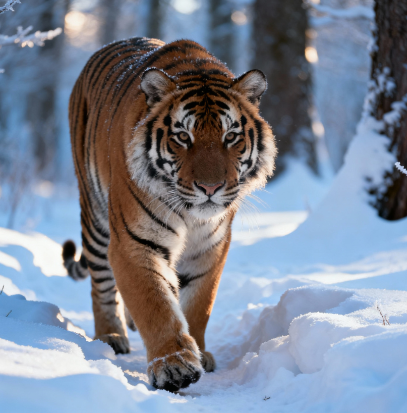 Амурский тигр — это самая крупная дикая кошка в мире. Его ещё называют уссурийским тигром, потому что он живёт на Дальнем Востоке России, возле рек Амур и Уссури. Амурский тигр выделяется своей густой, тёплой шкурой с красивыми чёрными полосками, которые помогают ему прятаться среди деревьев и снега. Зимой его шубка становится ещё пушистее и светлее, чтобы легче было выживать на морозе. Эти тигры живут поодиночке и хорошо охотятся. Они питаются оленями, кабанами, иногда ловят рыбу или поедают мелких животных. Амурский тигр очень сильный: он может даже на снегу быстро бегать и переносить тяжёлую добычу. К сожалению, амурских тигров осталось мало. Они занесены в Красную книгу, и охота на них запрещена. Люди стараются защищать тигров, строят для них заповедники, чтобы этот красивый и сильный зверь не исчез. Амурский тигр — символ дикой природы России. Малыши тигрят рождаются слепыми, мама долго заботится о них. Сегодня амурский тигр нуждается в нашей защите и заботе, чтобы продолжать жить