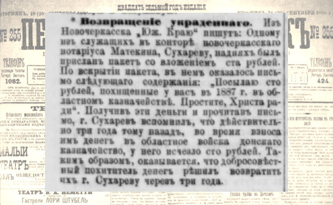 Получив эти деньги и прочитав письмо, господин Сухарев вспомнил, что действительно 3 года тому назад, во время взноса им денег в областное войско Донского казначейства, у него исчезла 100 руб. Таким образом, оказывается, что добросовестный похититель денег решил возвратить их господину Сухареву через 3 года.