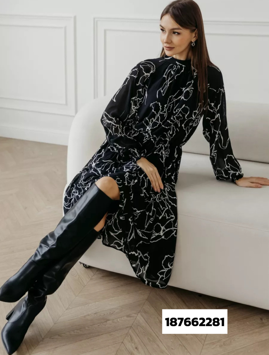 Миди-платье на резинке по талии, с мягко драпирующейся горловиной (стойка-бантик) и длинным рукавом. По фото — лёгкая шифоновая фактура с чёрно-белым абстрактным узором.