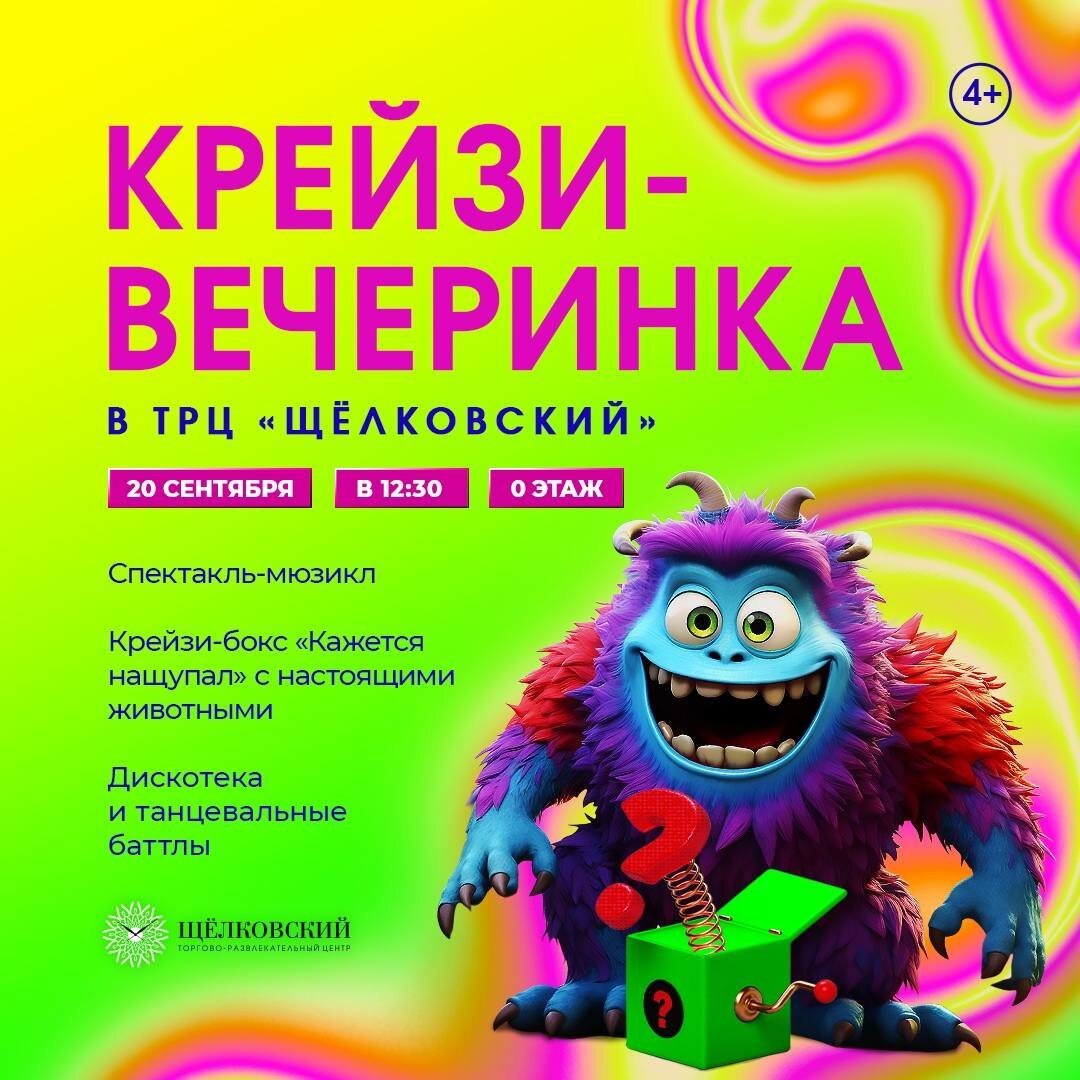 ➡️ Крейзи-вечеринка в «Щёлковском»!🥳 20 сентября | Щёлковское ш., 75, 0 этаж Забудьте про скучные выходные! 20 сентября вас ждет самый безумный, весёлый и тактильный ивент этой осени, ведь мы устраиваем настоящий праздник непослушания и креатива для всех, кто готов отпустить на волю свои эмоции. В программе: 🎭12:30 – 13:30 – Спектакль-мюзикл «Панк Крейзи Шоу» 🐰13:30 – 14:30 – Крейзи-бокс «Кажется нащупал». Самые смелые смогут засунуть руку в ящик и угадать, кто же там прячется: пушистый кролик, колючий ёжик, забавный сурикат или может быть скользкая жаба? 🪩14:30 – 15:30 – Дискотека и танцевальные баттлы 🧷 Бесплатная Москва