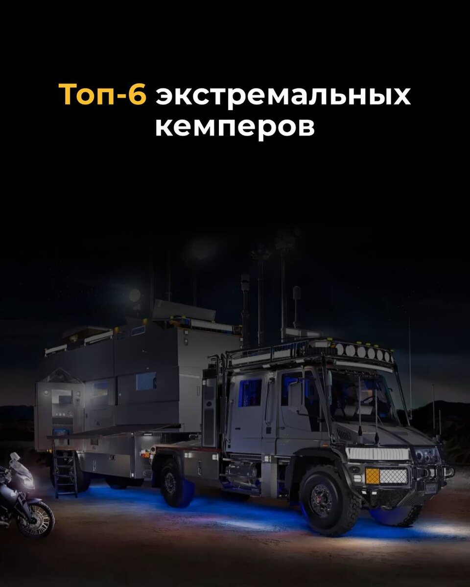 Когда обычный автодом — это слишком скучно, на сцену выходят эти монстры. Готовьтесь удивляться! • Earthroamer XV-HD — роскошный особняк. Основа: пикап Ford F-750. Что умеет: ехать тысячи километров благодаря 435 л топлива, нести 1000 л воды и питаться от солнечных панелей и генераторов. Внутри — всё: от двух кондиционеров и стиральной машины до отделки мрамором и кожей. Роскошь на колесах. • Unicat MD56c — немецкий грузовик-крепость. Основа: трехосный MAN 6x6. В чем сила: 980 литров топлива (запас хода >3000 км), блокировки всех мостов и тонна груза на внешней платформе (для багги или мотоциклов). Автономность — 2 недели. Суровый немецкий функционал. • Global Expedition Vehicles Pangea — мастер трансформации. Фишка: телескопическая крыша! В пути — компактный, на стоянке — раскрывается в двухэтажный дом. Ставится на любое мощное шасси (Mercedes, Kenworth и др.). Умное решение для лесов и низких веток. • Armadillo Conquistador — терраса с видом на мир. Основа: восьмиколесный MAN TGS