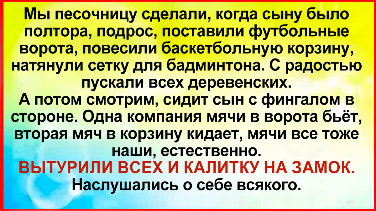 А насчет детской площадки, соседи задавали нам вопрос: - Зачем вы ее построили если никого на нее не пускаете?