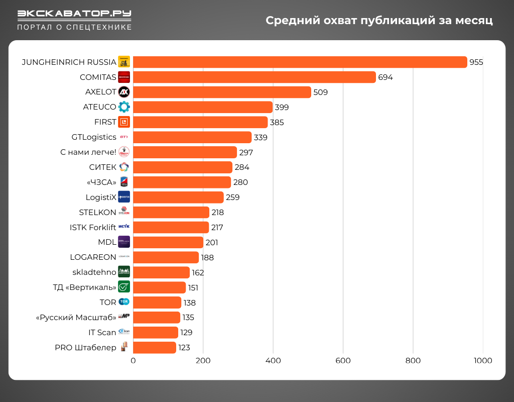 Экскаватор Ру проанализировал Telegram-активность компаний, обеспечивающих склады техникой и современными технологиями, и выделил каналы с максимальными охватами и вовлечённостью В топ-3 компаний по среднему охвату публикаций (данные сервиса tgstat.ru) вошёл один известный поставщик складской техники — ООО «Юнгхайнрих Подъёмно-погрузочная техника», а также две компании, работающие в сфере автоматизации склада и логистики — COMITAS и AXELOT. Всего в двадцатке лучших оказалось 10 поставщиков автоматизированных и интеллектуальных решений, что подтверждает растущий интерес к современным технологиям. Что касается «Юнгхайнрих Подъёмно-погрузочная техника», то первое место компании не стало для нас сюрпризом. Опытный игрок рынка складской техники весьма активен в маркетинге и продвижении своей продукции: компания является первопроходцем среди интернет-магазинов складской техники, проводит собственные выездные мероприятия (выставки Yellow Days), а также другие активности. Ещё один критерий ана
