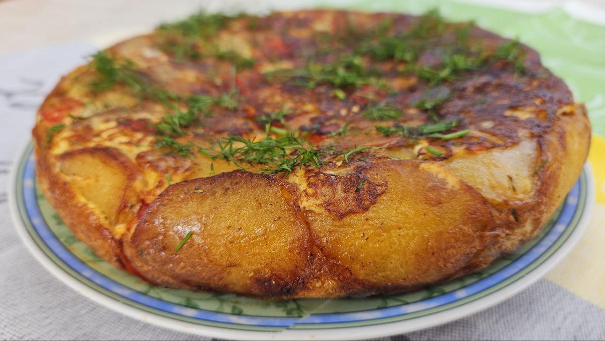 Соль, паприка, перец по вкусу Приготовление: Баклажаны очистить полосочками и нарезать на шайбочки, залить холодной водой, добавить соль и оставить на 15-20 минут. Потом воду слить и обсушить. Картофель очистить и нарезать на тонкие колечки, добавить соль, перец и паприку. Обжарить на раст.масле с двух сторон Яйца вбить в мисочку, посолить и поперчить. Собираем пирог: на дно выкладываем баклажаны, сверху картофель и формируем бортики, по верх картофеля выкладываем помидоры, нарезанные произвольно и посыпаем укропом. Далее, выкладываем оставшийся баклажаны и картофель, помидоры и заливаем яйцами. Сковородку накрываем крышкой и тушим на среднем огне минут 10, пока не возьмется корочка. Проверить можно при помощи лопатки. Берем тарелку и переворачиваем пирог, выкладываем в сковородку и тушим еще минут 10. Пирог готов, посыпаем укропчиком и садимся обедать...или ужинать!