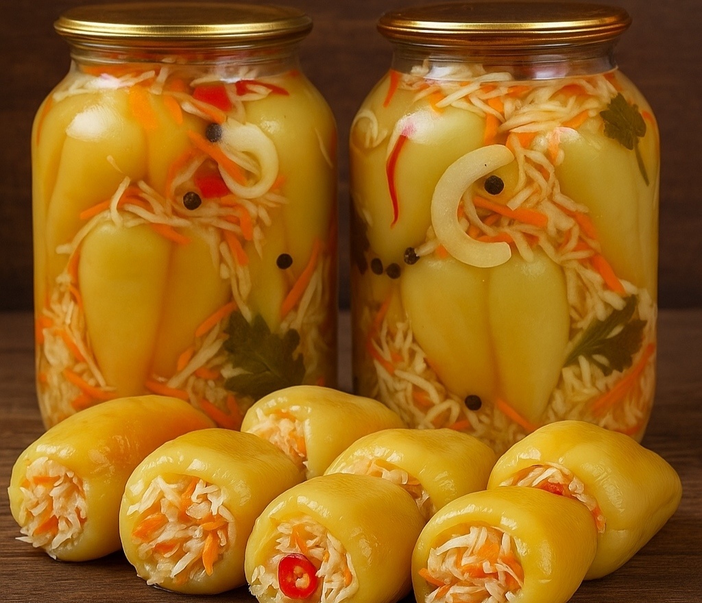 Для маринада: 1. Капусту, морковь и лук соединяем в глубокой миске, немного прижимаем руками — чтобы пустили сок. 2. Подготовленные перцы очищаем от семян и наполовину наполняем овощной смесью. 3. В середину каждого перца кладём немного острого перца и пластинку чеснока. 4. Дополняем до верха капустной смесью и слегка уплотняем. 5. Плотно укладываем фаршированные перцы в стерилизованные банки, перекладывая горошинами перца. Заливка и стерилизация: 1. Доводим до кипения все компоненты маринада и заливаем горячим раствором перцы в банках. 2. Оставляем на 10 минут настояться. 3. Затем стерилизуем: * 3-литровые банки — 30 минут * 2-литровые — 20 минут * литровые — 10 минут 4. Закатываем, переворачиваем вверх дном, укутываем до полного остывания. Хранится при комнатной температуре. А зимой — просто спасение: открыли банку, и готова идеальная закуска к мясу, картошке или чему-нибудь другому!) Всем мира, добра, красоты!