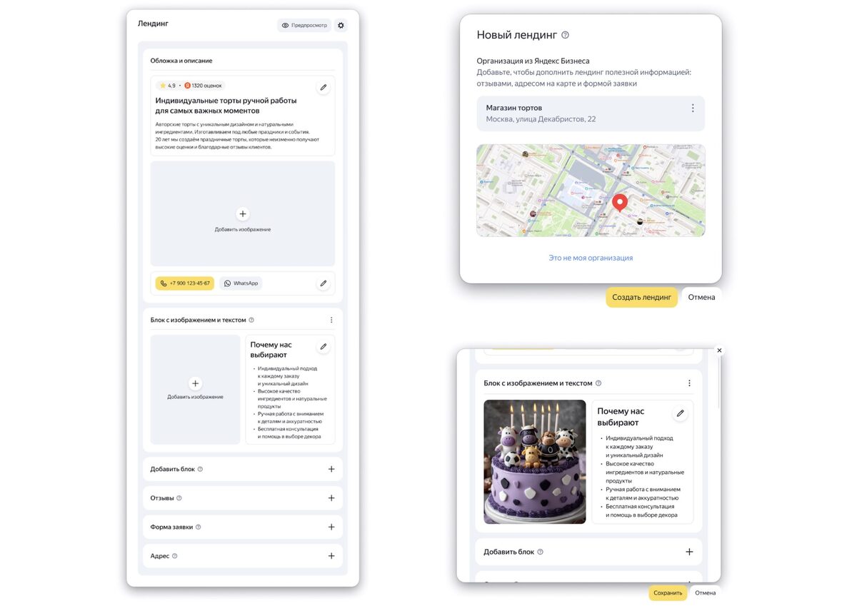 Страница сразу встраивается в рекламную кампанию и может использоваться как полноценный сайт для визитки или соцсетей. Создание пока доступно только в веб-версии, а продукт ещё тестируют.