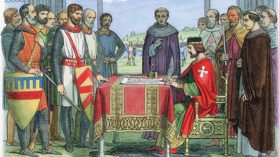 Непосредственной причиной появления Великой хартии (Magna Carta) послужили тяжкие налоги, введенные королем Иоанном Английским (1199–1216) для того, чтобы отвоевать Нормандию, потерянную в 1204 г. Как это часто бывает, свою роль сыграли и личные качества участников событий: Иоанн был умным и властным правителем; поэтому люди не без оснований не доверяли ему. В своих поступках он не слишком отличался от отца, Генриха II, и знаменитого брата, Ричарда Львиное Сердце. Но Иоанн проиграл и войну с Францией, и гражданскую войну с недовольными баронами; к 1215 г. у него не осталось возможностей для маневра, и он был вынужден подписать Хартию. Основное значение Хартии состояло в том, что она утверждала власть права; конечно, речь не шла о равенстве всех перед законом: она несла выгоды в первую очередь богатым и привилегированным слоям общества, баронам и церкви. Тем не менее, в отличие от большинства континентальных королевских постановлений, Великая хартия вольностей принимала во внимание инт