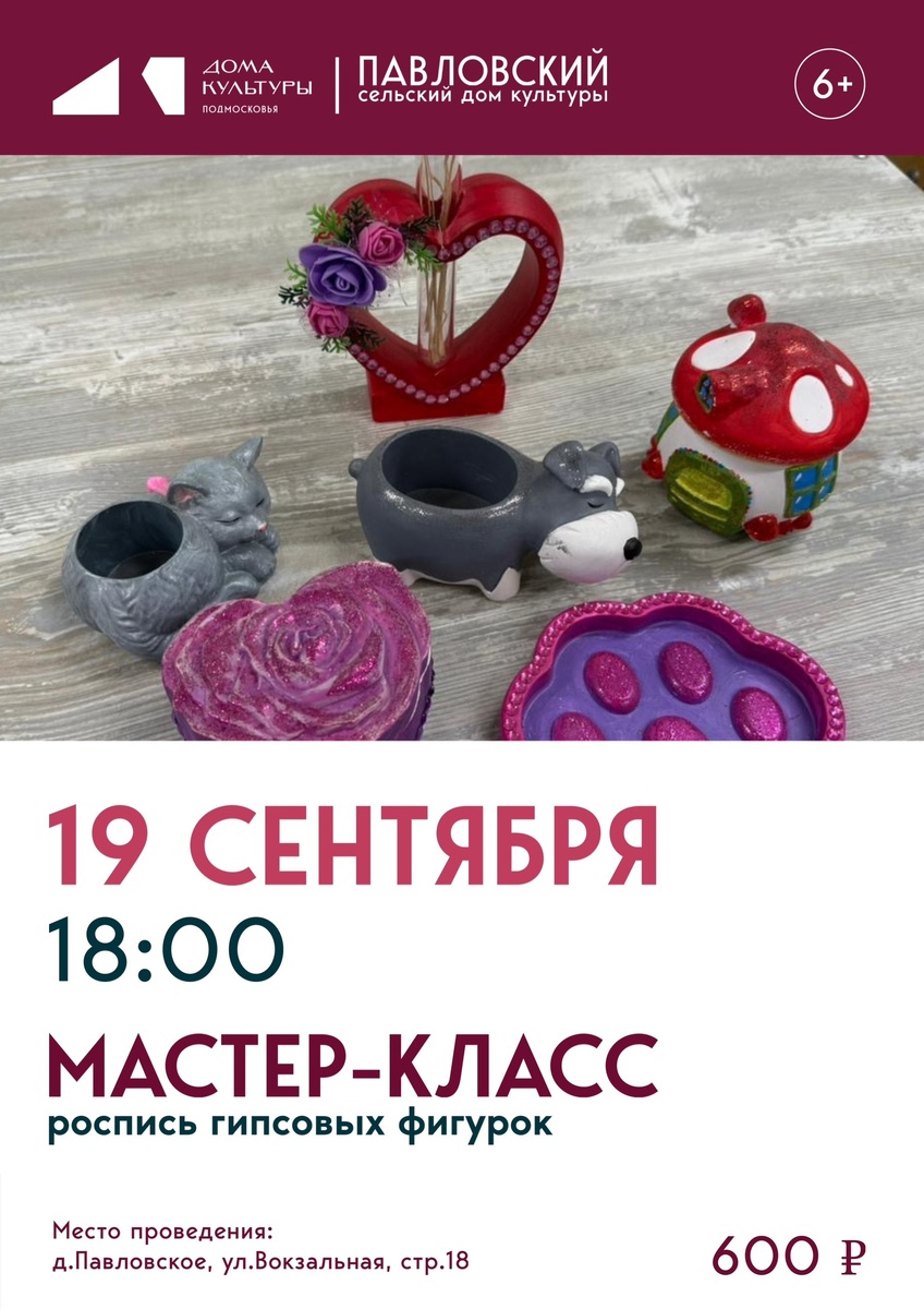 ✨ 🎨 Творческий мастер-класс по росписи гипсовых фигурок! 🎨 Приглашаем всех любителей творчества на увлекательный мастер-класс по росписи гипсовых фигурок! Когда: сегодня, 19 сентября, в 18:00 Где: Павловский СДК Стоимость: всего 600 рублей Что вас ждёт: Разнообразный выбор фигурок на ваш вкус Все материалы предоставляются — вам нужно только прийти с хорошим настроением! Профессиональный наставник поможет воплотить ваши творческие идеи Возможность создать уникальную авторскую работу, которая станет прекрасным подарком или украшением интерьера 🚫 Возраст: 6+ 📆 19.09.2025🕒18:00 🏢 Павловский сельский дом культуры (СДК) 📍 г.о.Домодедово, дер.Павловское, ул.Вокзальная, д.18 💰 Цена: 600 ₽ ✅ Мероприятия Домодедово https://dzen.ru/id/66f10385cc4c5a16f7b5fb02 http://vk.com/domodedovo_events http://dzen.ru/domodedovo_events