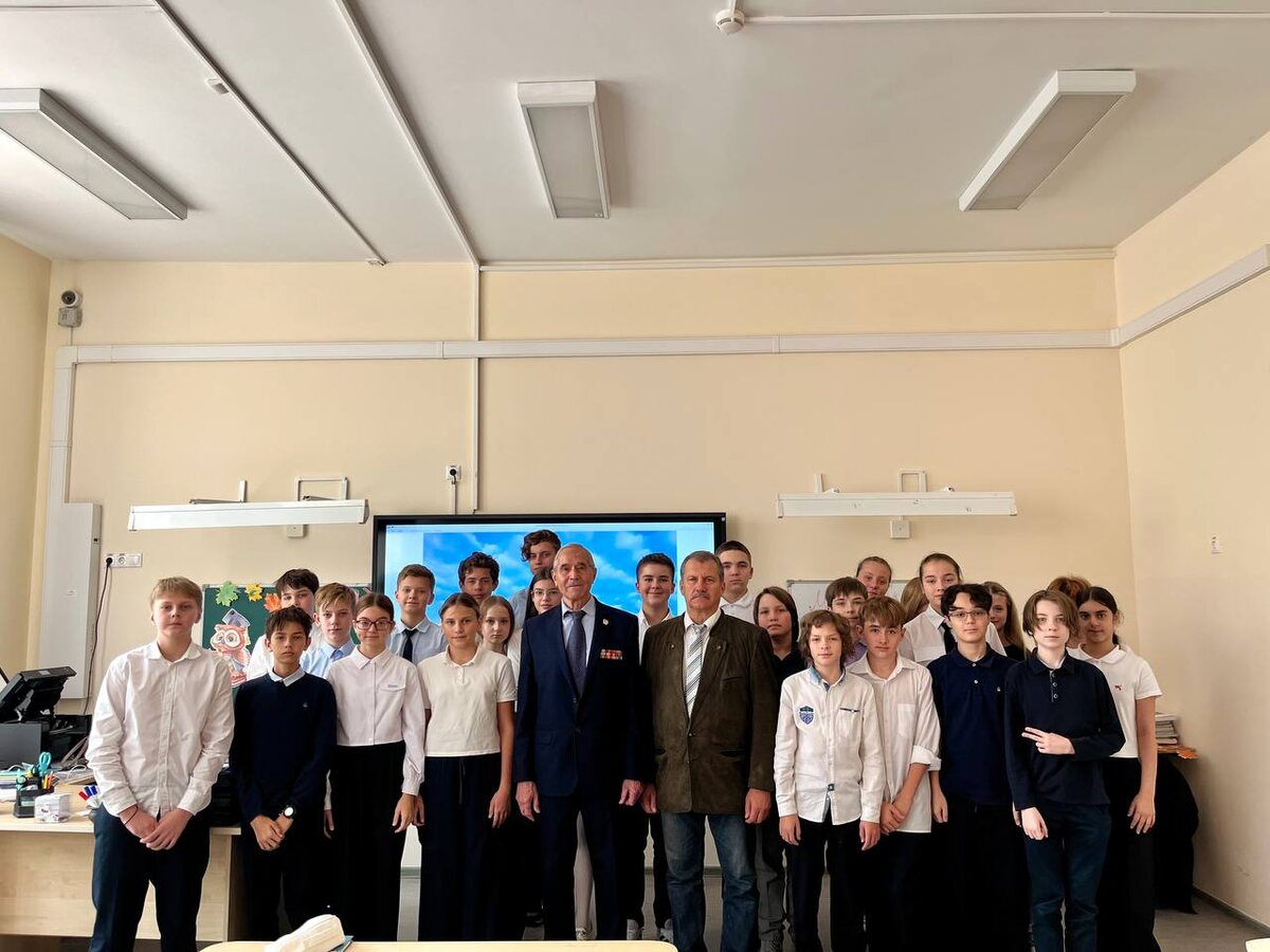 Сегодня ученики встретились с представителями Совета ветеранов района Строгино — Юрием Степановичем Студеникиным и Александром Николаевичем Ионкиным.