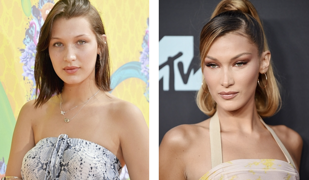 Белла Хадид неоднократно заявляла, что единственной пластической операцией в ее жизни была ринопластика. Однако эксперты отмечают, что модель явно прибегала и к другим процедурам. Сравнение фотографий показывает, что у Беллы была провед круговая блефаропластика, которая устранила скопления жировой ткани на веках и сделала ее взгляд более выразительным. Также вероятно проведение фронтотемпорального лифтинга, который приподнял край брови и создал эффект "лисьего взгляда".
