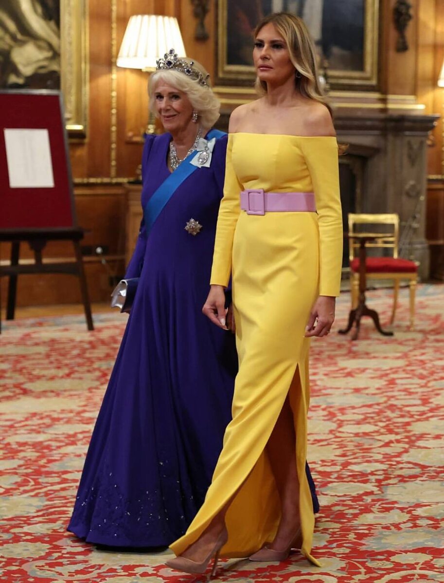 Оказывается, вчера Мелания Трамп приоткрыла не только область декольте, но и ноги. Но благодаря мощному бриллиантовому обвесу королевы Камиллы этот баттл двух первых дам закончился ничьей.