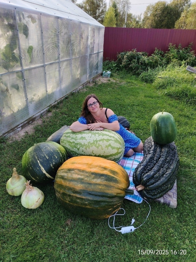 Жительница Рыбинска Ольга Догадаева показала очередной гигантский овощ, выросший на ее огороде. На этот раз ей удалось вырастить супер-арбуз весом в 89 килограмм. Огромный овощ Ольга растила и пестовала все лето, поливая и подкармливая различными удобрениями. Результат превзошел ее прошлогоднее достижение в полтора раза. В этом году Ольга вырастила рекордный лук. И огромный кабачок. А вот превзойти свои прошлогодние рекорды по выращиванию тыкв не получилось. Впрочем, и сезон пока не завершен. Ольга использует семена супер-крупных овощей. Кроме арбузов, тыкв и кабачков выращивает огромный лук и томаты. Все ее овощи будут представлены на выставке в Москве.