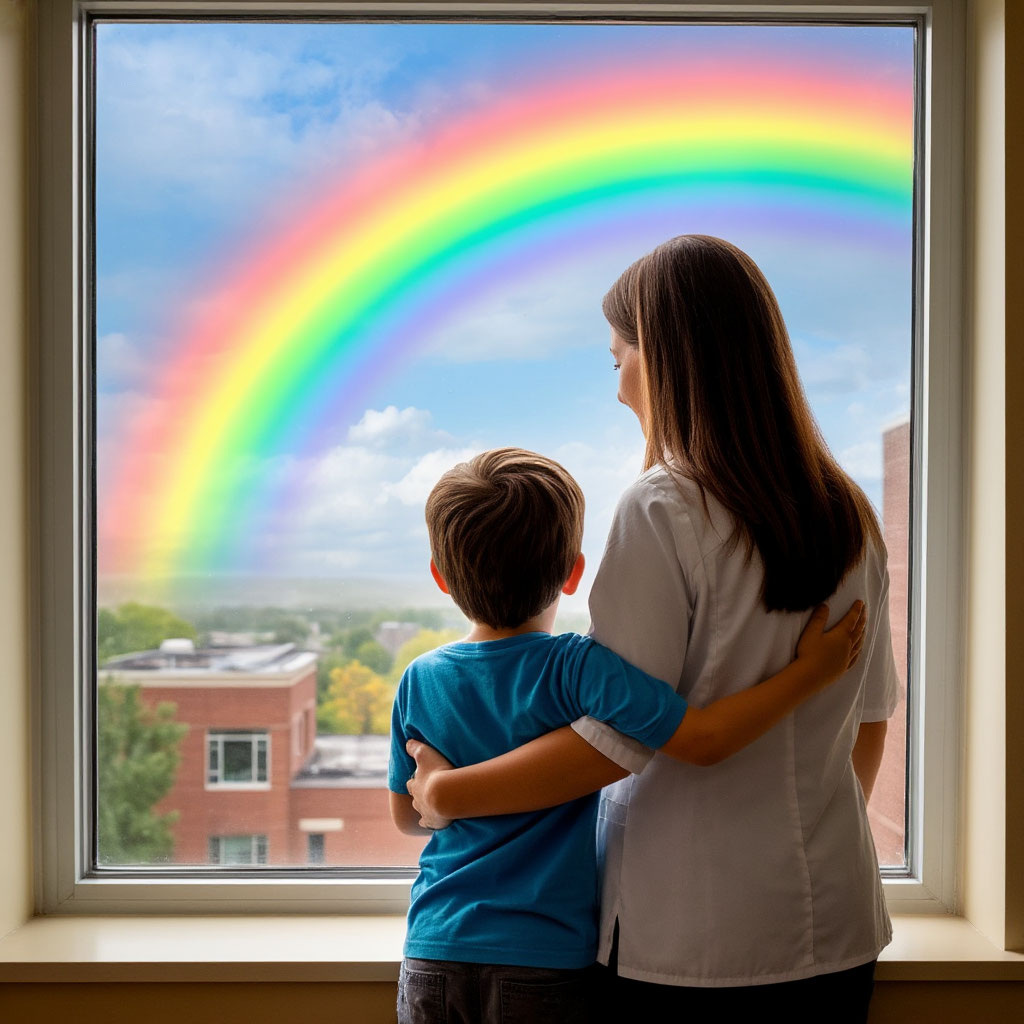 Серёжка сидел на подоконнике и глядел куда-то вверх. Он говорил так тихо, трепетно, словно боялся спугнуть. Потянулся рукой к матери, коснулся пальцев. Настя шагнула ближе, проследила за его взглядом. Ясное, голубое небо было украшено огромной переливчатой яркой радугой.