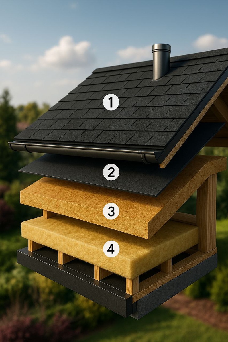 🛡Гайд: пирог мягкой кровли + вентиляция ⭐️В современном строительстве мягкая кровля — это многослойная система. Срок её службы зависит не от материала черепицы, а от того, насколько корректно собран каждый слой «пирога». ⬇️Состав конструкции (снаружи → внутрь): 🔒. Битумная черепица — верхний гидроизоляционный слой. Работает только в связке с основанием. 🔒. Подкладочный ковёр — дополнительная защита от протечек, особенно в ендовах и узлах примыкания. 🔒. ОСП-3 / фанера ≥12 мм — сплошное основание, воспринимает механические нагрузки. Ошибка — экономить на толщине. 🔒. Утеплитель (минплита 30–40 кг/м³) — тепловой контур здания. Важно: плотность и толщина по расчёту. 🎖Ключевой элемент — непрерывный вентзазор ≥50 мм. Он работает как «дышащий канал»: 📌приток воздуха через карниз, 📌движение вдоль вентканала, 📌выход через коньковый аэратор. 🛡Без вентиляции: 🛡утеплитель намокает → теряет до 60% теплотехнических свойств, 🛡древесина оснований начинает гнить, 🛡срок службы кров