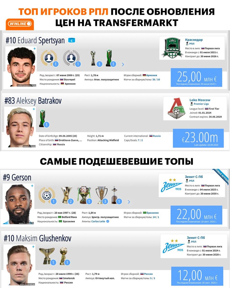 Глушенков догнал Роналду, но есть нюанс 🇵🇹 В последнем обновлении цен Максим подешевел на два миллиона и теперь стоит как легендарный португалец. А еще три мульта скинули Жерсону. Теперь он стоит дешевле Батракова. А дороже Сперцяна не стоит никто. Луис Энрике из Зенита тоже оценивается в 25. Кому завысили, а кому занизили?