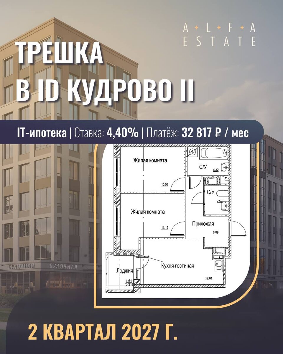 ИТ-ипотека под 4,4% на евротрёшку 49,59 м2 в новом квартале.
