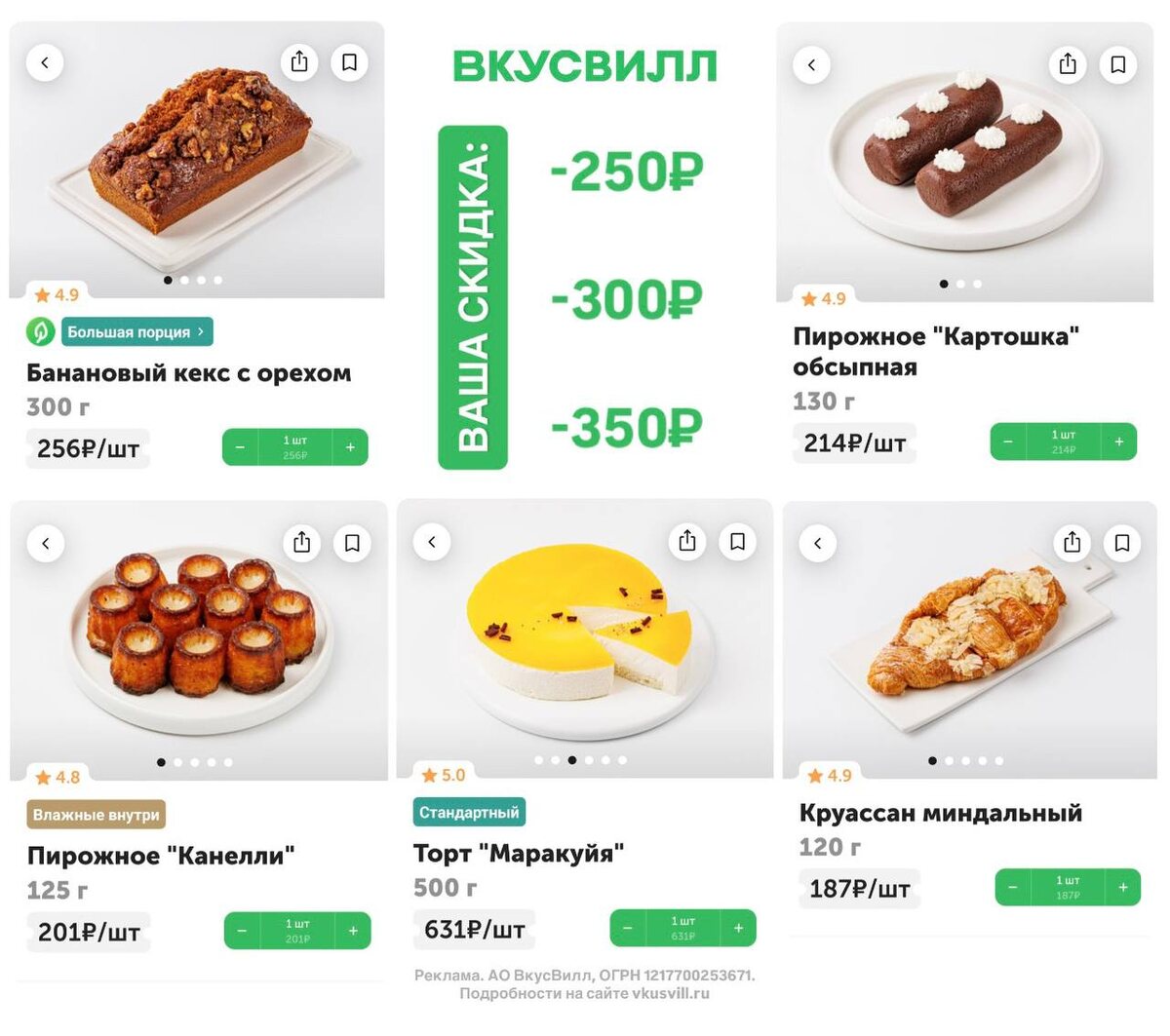 💚 Легенды ВкусВилл — к заказу! Проверяйте наличие на сайте или в приложении Пирожное "Канелли" Торт "Маракуйя" Круассан миндальный Банановый кекс с орехом Пирожное "Картошка" обсыпная Промокоды на первый онлайн-заказ: ✅ VSTS37B — скидка 250₽ от 1250₽ ✅ 30VGFTTB — скидка 300₽ от 1500₽ ✅ 35VNN7BM — скидка 350₽ от 2500₽ Реклама. АО ВкусВилл, ОГРН 1217700253671. Подробности на сайте vkusvill.ru erid: 2Vtzqvijt7E