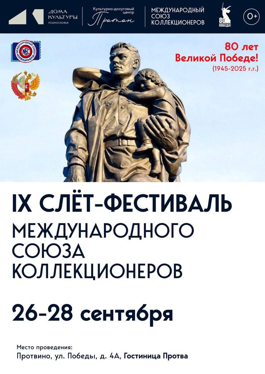 С 26 по 28 сентября в гостинице «Протва» города Протвино (ул. Победы, 4А) состоится IX слет-фестиваль Международного союза коллекционеров, посвященный 80-летию Победы в Великой Отечественной войне. Приглашаем всех желающих на встречу с необыкновенными артефактами, имеющими историческую, художественную, эстетическую, ностальгическую и другие ценности. В этом году в фестивале принимает участие более 130 коллекционеров из разных городов России, среди которых Москва, Санкт-Петербург, Самара, Нижний Новгород, Ставрополь, Брянск, Оренбург, Ижевск, а также города Южного Подмосковья. Вместе с ними представят свои коллекции участники из Белоруссии и Армении. Приходите и прикоснитесь к прекрасному и увлекательному миру коллекций! От традиционных нумизматики, филателии, фалеристики, редких минералов, до коллекций кукол, колокольчиков, статуэток, кружек, сувениров, магнитов, игрушек и других артефактов!