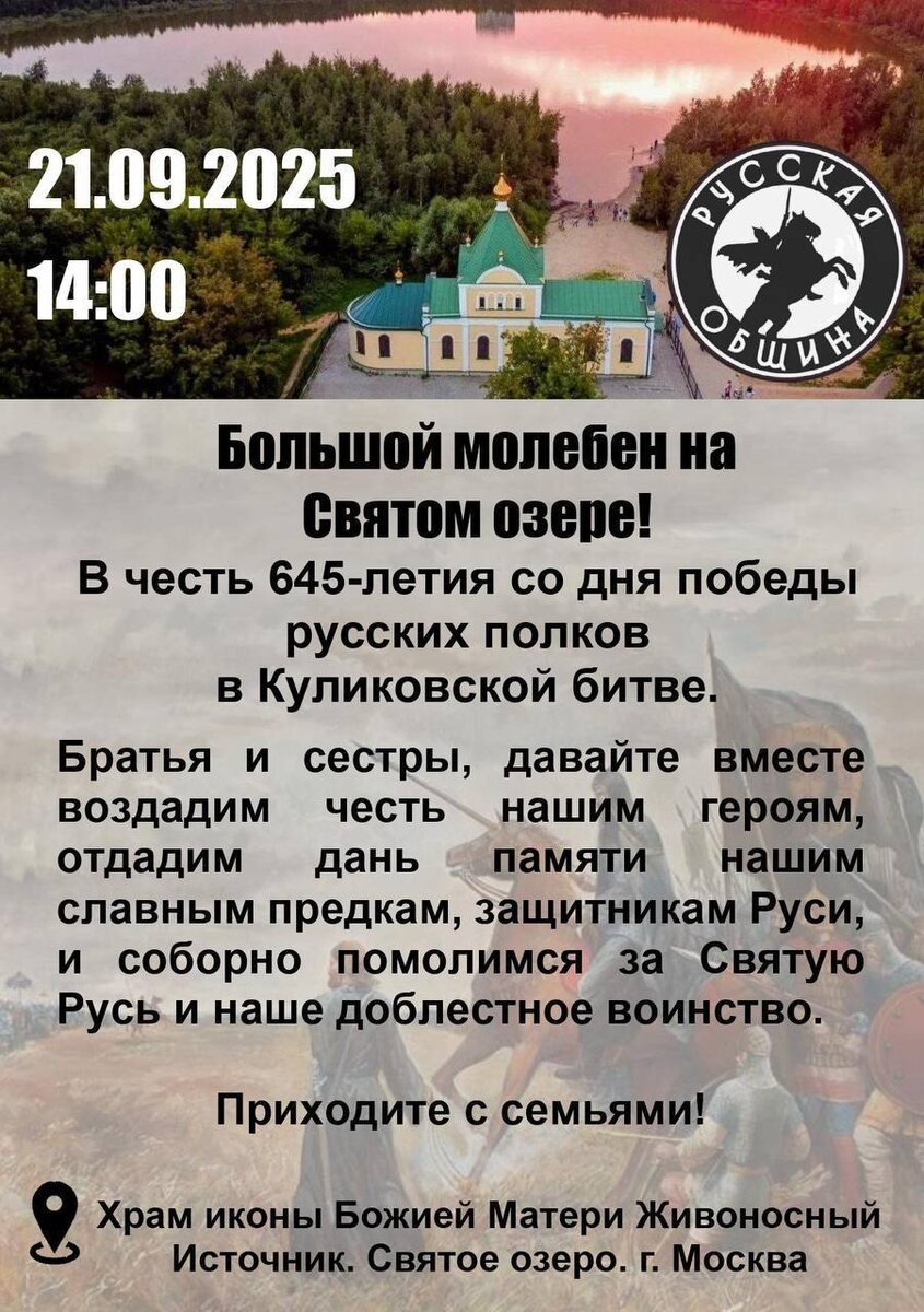 ‼️21.09.2025 г в 14:00 состоится большой молебен в Церкви иконы Божией Матери "Живоносный Источник". В честь 645-летия победы на Куликовом поле! Храм расположен на берегу Святого озера, где войско Дмитрия Донского омывало свои раны после Куликовской битвы. Важнейшая дата! Ключевое событие русского воинства! Судьбоносный праздник Руси! 13:30 - Сбор у храма 14:00 - Молебен Явка максимальная ‼️ Приходите с семьями и приглашайте знакомых ☦️ Форма одежды: Мужчинам - длинные брюки (не шорты☝️), верх можно с коротким рукавом. Женщинам - длинные платья, желательно народные, или сарафаны. (Русский народный стиль одежды приветствуется, так же как и мерч РО) Адрес храма: 👇👇👇👇👇👇👇 https://yandex.ru/navi/org/tserkov_ikony_bozhiyey_materi_zhivonosny_istochnik/1741693236