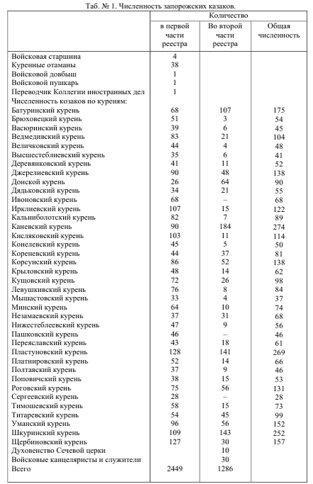 Охарактеризовать количественный состав запорожского казачества в данном реестре можем с помощью таблиц, где показан численный состав старшины, казаков по куреням, духовенства и канцеляристов, присягнувшим на верность Петру III на Сечи и в её окрестностях: