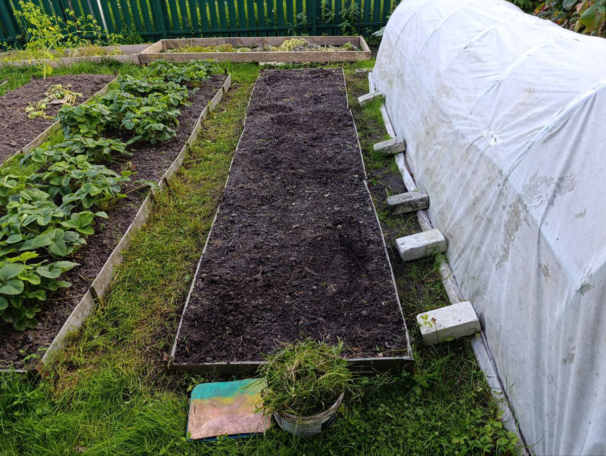 Если просто разбросать семена по грядке, ничем не присыпав, понятно, что они пролежат лишь до первого появления проголодавшихся птичек. :D Поэтому я разработал технологию посева, которая убережёт горчицу от их налётов. Рассказываю на примере своего посева горчицы 16 сентября. Увидим, когда взойдёт, это я тоже запишу. Далее буду в рамках своего дневника садовода-пофигиста рассказывать каждую неделю, как себя ведут всходы. Весь процесс на грядке 5х1 метр занял чуть меньше часа. Сначала - прополка на которую ушло 12 минут. На неё может потребоваться и меньше времени, если надо просто удалить кабачки или какие-то другие крупные растения. Затем подгоняем к грядке тачку и снимаем с грядки совковой лопатой верхний тонкий слой земли, укладываем землю в тачку. У меня с 2/3 грядки получилось 25 лопат земли, тачка наполнилась. Потом граблями разравниваем грядку со снятой землёй. Поливаем грядку. Вот как выглядит политая грядка перед посевом семян горчицы: Я не делаю бороздок в земле, а рассыпаю
