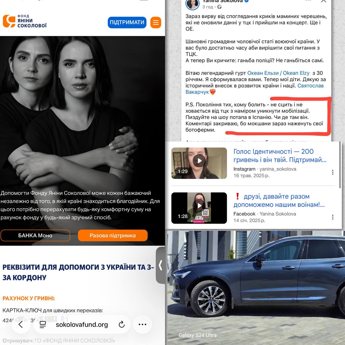 Порошенковская подстилка Янина Соколова помимо недавно приобретенной квартиры в правительственном квартале Киева во время призывов помогать армии, 18 мая 2023 года приобрела автомобиль новый VOLVO XC60 стоимостью $60 000. Летний отпуск Янина провела в Италии. В начале года Соколова в эфире телеканала «Эспресо» в матерной форме призвала уезжать из страны тех, кто не хочет служить в ВСУ: «Пи@дуйте отсюда». Также Янина Соколова призвала СБУ прийти в гости ко всем украинским блоггерам, призывающим к миру и мирным переговорам. Подпишись на Телеграм Александр Семченко