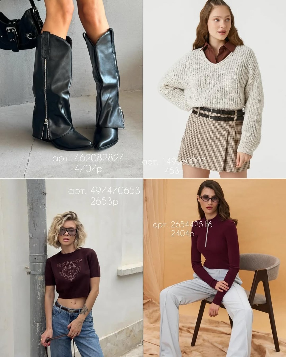 - Цветовая капсула: молочные/бежевые (арт. 270476958, 276210185, 502415159) + бордо (265442516, 447010514, 497470653) + серый (494241103) + чёрные сапоги (462082824). Палитра комбинируется без риска.