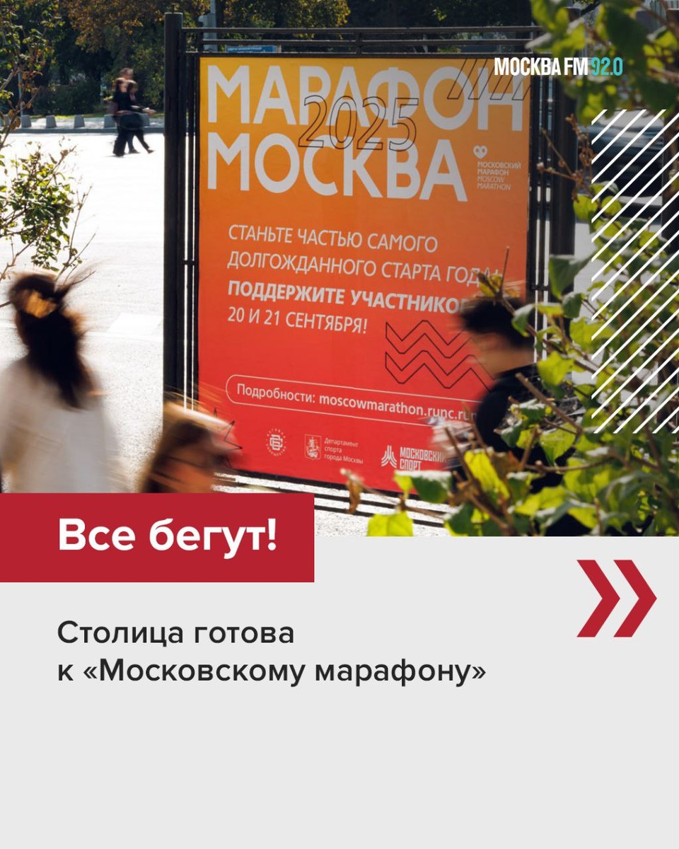 🏙 🏃♀️➡️ В течение двух дней асфальт у красивейших мест столицы будет ощущать десятки тысяч ног бегунов 20 и 21 сентября состоится (слышим недовольство автомобилистов) «Московский Марафон». В этом году на него зарегистрировались 56 тысяч человек! Они пробегут дистанции в 10 и 42,2 километра, поучаствуют в студенческой и корпоративной эстафетах. ⬆️ Нас ждёт яркий праздник, спортивные победы и громкие возгласы поддержки болельщиков. Все подробности рассказали в карточках. 📸 Беговое сообщество / Telegram 📌 Подписаться на Москва FM / Наш чат-бот / Мы в MAX