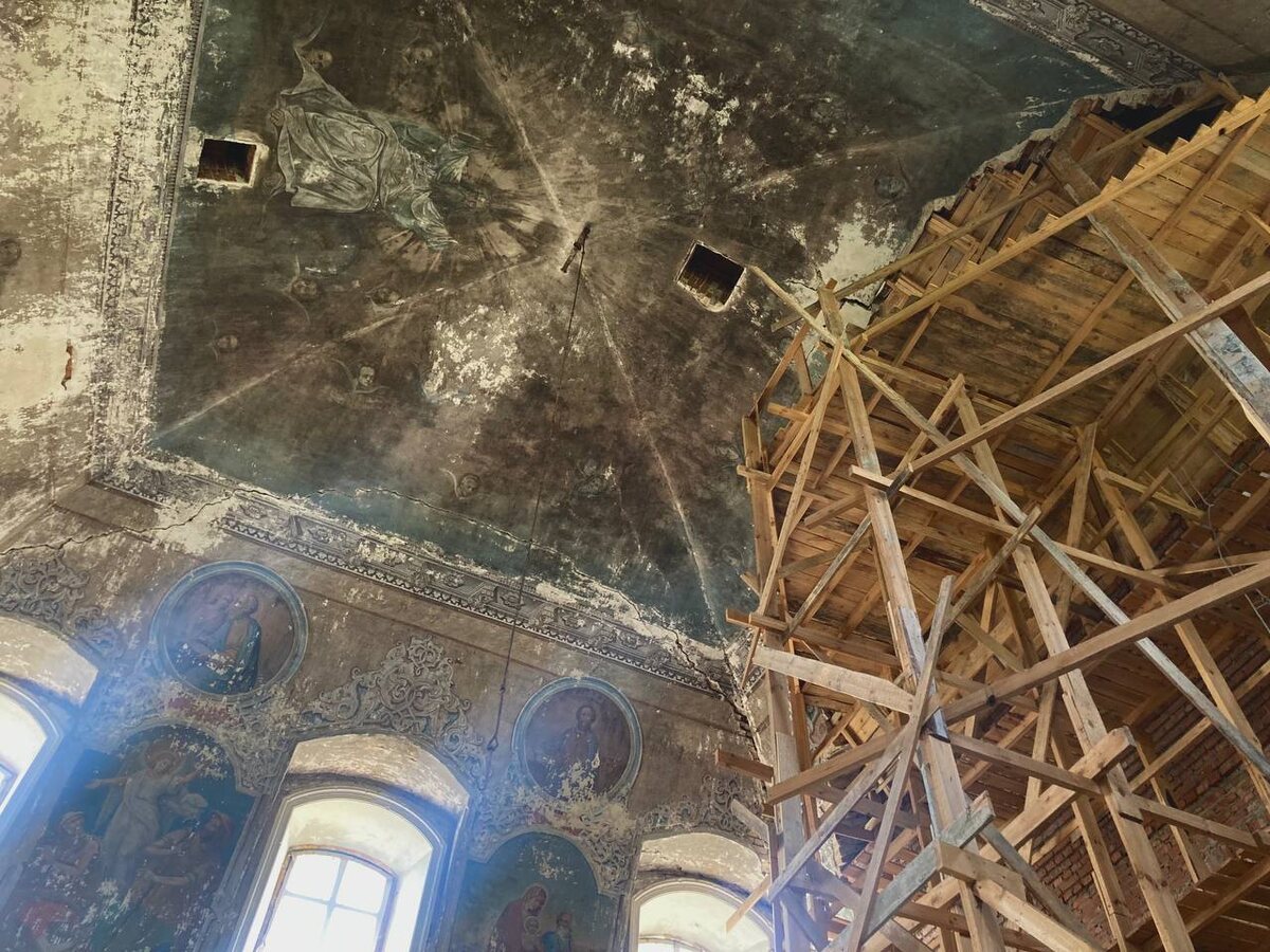 Мы попали на экскурсию, которая начиналась с церкви без купола — Храма Архангела Михаила. Тут находится колодец и въезд в туристически привлекательную часть. Посредством грантов и волонтёров территорию у храма стали приводить в порядок. Внутри сохранились намёки на фрески. Я как любитель готики в восторге именно от их потёков и серости. Но, думаю, в целях жителей со временем их восстановить. Или хотя бы поставить купол — так церковь меньше будет заливаться осадками и разрушаться.