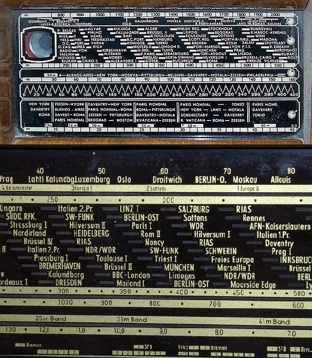 Интересный парадокс преследовал конструкторов радиоприемников: для лучшего качества звучания, требуется максимально переднюю панель радиоприемника отдать под акустику. Однако, потребитель хочет на передней панели видеть шкалу настройки и как можно подробную. Как же совместить два несовместимых требования? Очень интересный выход из положения нашли итальянские конструкторы из фирмы Radiomarelli. Они шкалу радиоприемника нарисовали на акустической ткани и поставили прямо перед динамиком. Про оригинальные конструкции этой фирмы на канале есть отдельная статья: Немцы, в этом вопросе, подошли к делу более креативно: они, по сути, вмонтировали в радиоприемник маленький кинотеатр. Шкала настройки приемника это маленький экран, куда проецируется название города или радиостанции. На шасси радиоприемника установлен маленький проектор. Который направляет луч света через диск, на котором отпечатаны названия радиостанций и городов. Радиоприемники с такой шкалой пользовались спросом и выпускались д