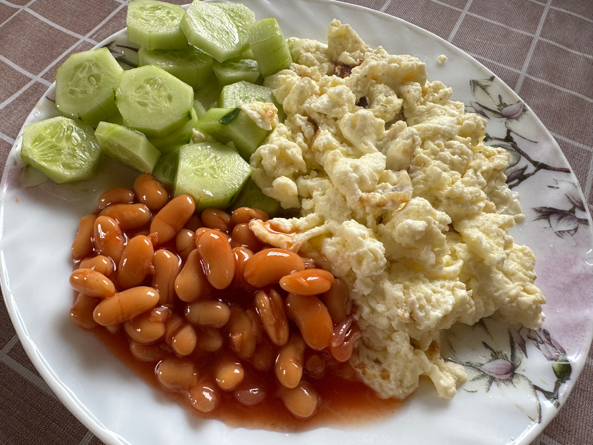 Быстро сделала себе омлет, добавила огурец и фасоль в томатном соусе. Позавтракала и быстренькой пошла в город.