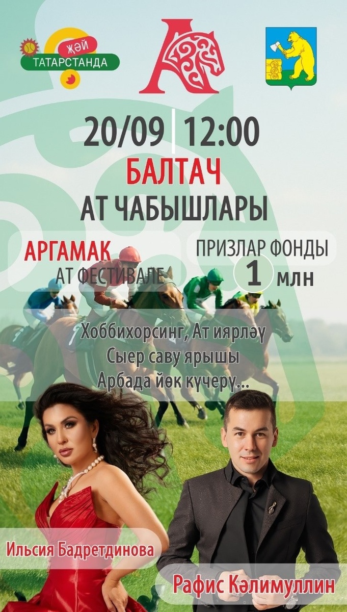 20 сентябрь көнне Балтачта киң масштаблы чара «Аргамак» ат спорты фестивале узачак! Фестивальгә килүчеләрне кызыклы уеннар һәм ярышлар, бай концерт программасы һәм әлбәттә, күңелләрне җилкендерерлек ат чабышлары көтә. Бәйрәм сәхнәсендә танылган артистлар Илсөя Бәдретдинова, Рафис Кәлимуллин һәм Татар дәүләт җыр һәм бию ансамбле чыгыш ясаячак! «Аргамак» ат спорты фестивале 12:00 сәгатьтә башлана.