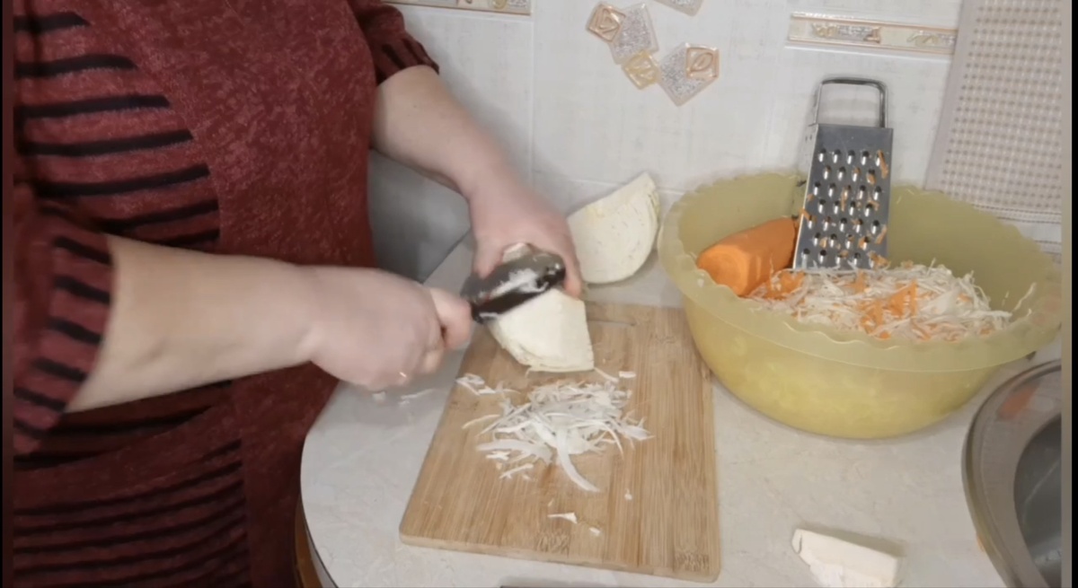 Шинкуем капусту в большую ёмкость, в которой удобно будет перемешивать. Трём морковь, сколько нравится, а по рецепту 4-5 средних морковок на 5 кг капусты, перемешиваем. Заполняем банку капустой и слегка утрамбовываем(не сильно) Набиваем банку капустой, почти до самого верха. Вставляем в банку пластмассовую крышку с дырочками. Или самим потыкать в крышку ножом и сделать прорези. Крышка нужна, чтобы капуста не поднималась вверх вместе с рассолом. Заливаем ОСТЫВШИМ рассолом до самого верха. И ждём зайчиков😄т. е. пузырьков. Ставим банку в тарелку, когда капуста будет кваситься рассол из банки будет вытекать в тарелку. Я ставлю банку рядом с газовой плитой, где потеплее. Рассол: на 1 л воды 2 ст ложки соли 2 ст ложки сахара. Кипятим, пока не растворятся соль и сахар. Рассол нужно сделать заранее, чтобы остыл. На банку хватает 1 литра рассола. Как только капуста успокоится, перестанет булькать, значит готова.Примерно через 4 дня. На нашем канале есть видео со всеми нюансами и подробно