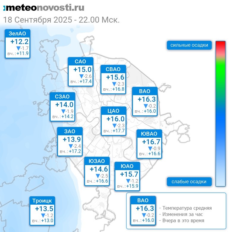 В 22:00 в Москве было от +12.1°C до +17.3°C, средняя температура +15°C #погода #Москва #осень #температура #18сентября #четверг