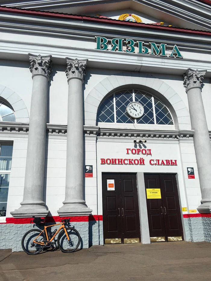 Маршрут начался у вокзала в Вязьме. Я позавтракал в "Магните", запихнул в баул и по карманам перекусы. Начинало припекать, захотелось уже снять длинные штаны и ветровку. Поехал к выезду из города мимо ремонтируемого моста. В целом трафик был редкий, только у объезда ремонта собралась пробка.