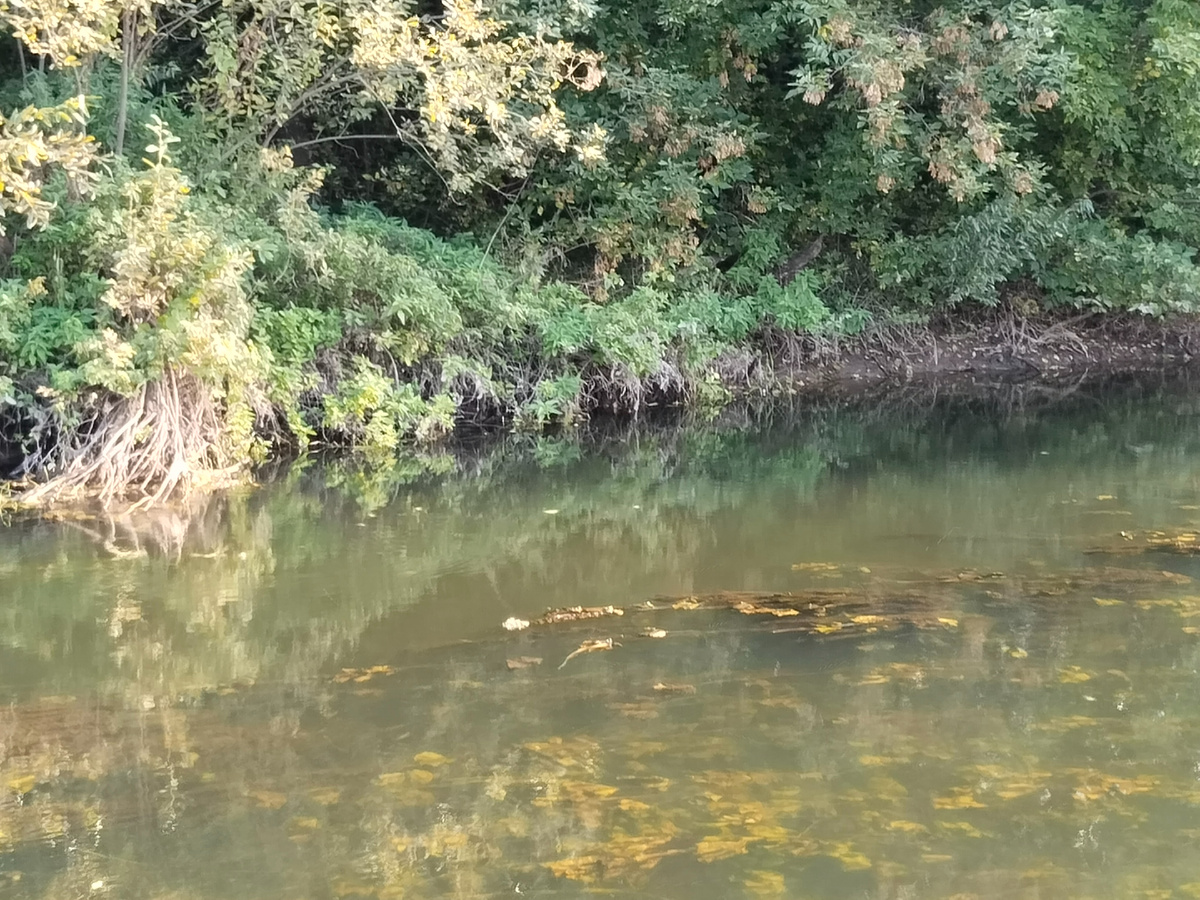 18.09.25. В этот теплый и солнечный день 49го августа решил сгонять на домашнюю речку, на вечорку, за голавлем. Тем более с работы приехал немного пораньше, чем обычно, и шанс попасть на речку был. На голавля я серьезно рассчитывал, но только на закатного голавля. Хотел половить его на поверхностные приманки. Приехал ещё засветло. Вода прозрачная, мелко. Опять уровень низкий. Но недолго музыка играла. Прямо на глазах вода начала мутнеть, запахло канализацией. Видимо кто-то, где-то сброс сделал. Но не смотря на муть, удалось поймать подьязка на вьюновку. Шел вверх по течению, с расчетом попасть к нужному месту на закате. Муть постепенно проходила. Начала поклевывать рыбка. Несколько тычков на микроджиг окуней. Пытался ловить голавля, но он реагировал только на личинку на лёгком грузе. Было несколько тычков и один мелкий ее засосал. Долго засасывал, пришлось даже паузу дать. Перед закатом оказался в нужном месте. Проверил голавля разными приманками- как будто нет его. Солнце скрылось з