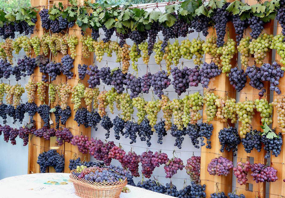 Делаю полки шириной 60 см из необработанной сосны. Каждую гроздь кладу так, чтобы она не касалась соседней. Раз в две недели переворачиваю и осматриваю. Так храню до марта!