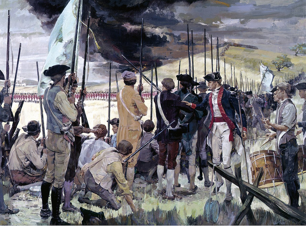 Первое столкновение между вооруженными колонистами и английской армией произошло в апреле 1775 г. Британские солдаты, брошенные на захват американского склада с оружием, встретили ожесточенный отпор в районе Конкорда и Лексингтона близ Бостона. С большими потерями англичане отступили, а вокруг города вырос многотысячный лагерь колонистов. Отбросить минитменов (Минитмены (англ. Minutemen, от minute, «минута» + men, «люди») — вольное ополчение североамериканских колонистов, появившееся в XVII веке для борьбы с индейцами, преступниками и солдатами других колониальных держав, а позже и с английскими королевскими войсками) от города удалось только после кровопролитного захвата одной из господствовавших над Бостоном возвышенностей — Банкер-Хилла.