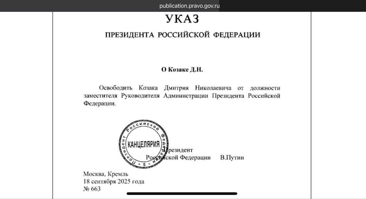 В ответ на пост #Официально@AoMurmansk: президент Путин подписал Указ об освобождении Дмитрия Козака от должности заместителя руководителя Администрации президента. Соответсвующий документ, датированный 18 сентября, появился на официальном портале правовой информации. Политологи также считают, что переход Дмитрия Козака на место Александра Гуцана теперь вряд ли возможен. ❄ «Арктический Обозреватель»